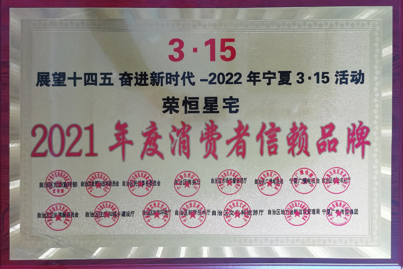 “荣恒星宅”2021年度消费者信赖品牌——自治区党委宣传部等15家单位2022年3月15日颁发